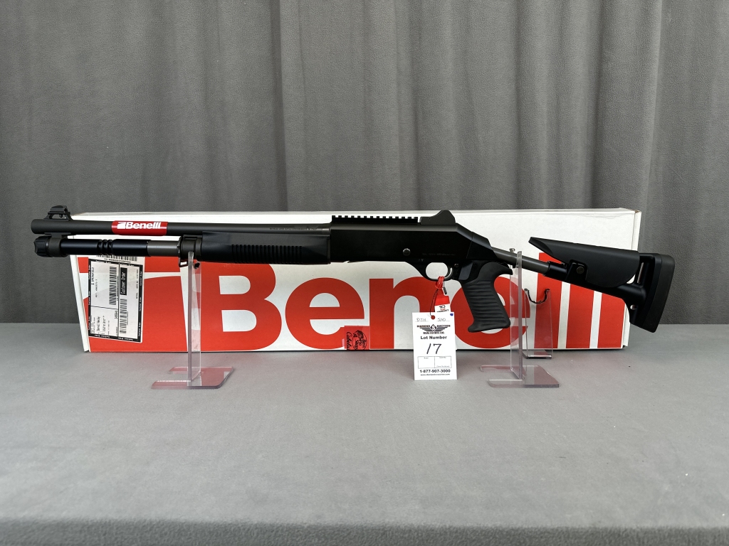 LOT 17. BENELLI M1014, 12GA, 18.5″, 5+1, SKELETONIZED STOCK, GHOST RING SIGHTS, FIXED MODIFIED CHOKE, NIB. SN: Y182949Q IT22