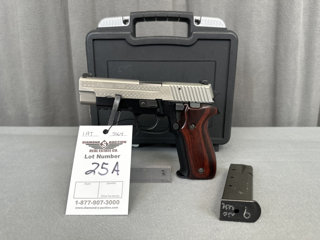 LOT 25A. SIG SAUER P226, 9MM, BI-TONE STAINLESS, ENGRAVED SLIDE W/ DIAMOND PLATE DESIGN, BOTTOM RAIL, HARD CASE & (2) MAGS. SN: U873953