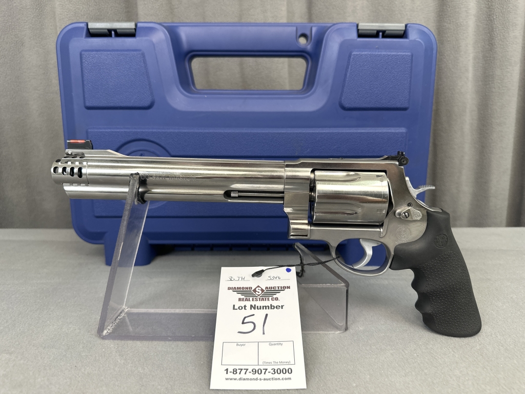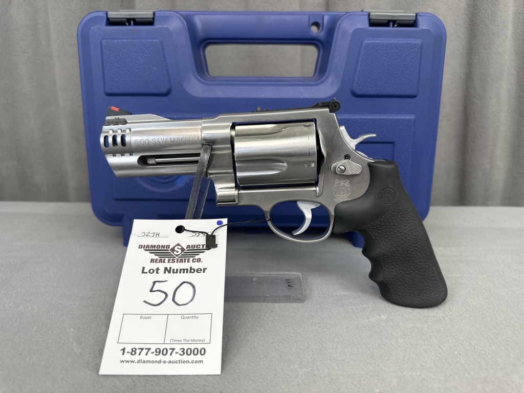 LOT 51. S&W M500, STAINLESS, .500 S&W, 8.375″ COMPENSATED BARREL, HI-VIZ SIGHT, X-FRAME, SKU 163501A, LNIB. SN: DJC0450
