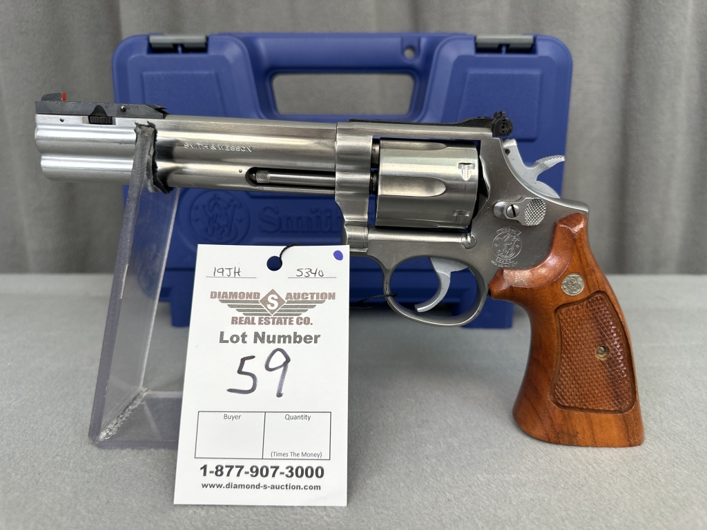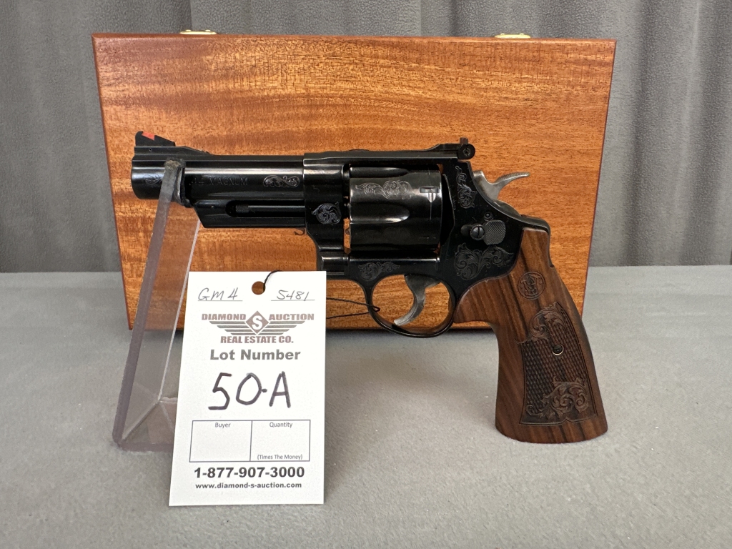 LOT 50A. S&W MOD. 29-10, .44 MAG, 4 3/4″ BARREL, 6-SHOT, HIGHLY ENGRAVED, WOODEN PRESENTATION CASE. SN: DMV9537