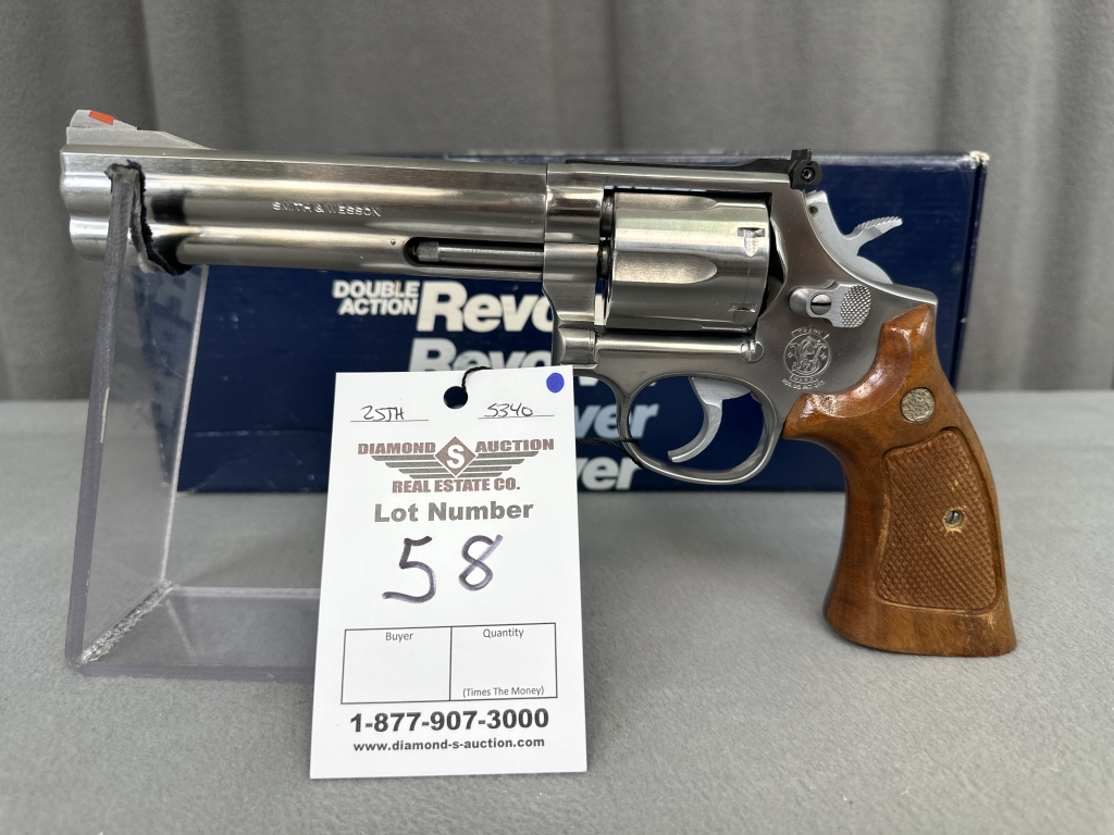 LOT 58. S&W 686-2, DA/SA, .357 MAG, STAINLESS, 6″ BARREL, WOOD GRIPS, BOXED. SN: AZC2800